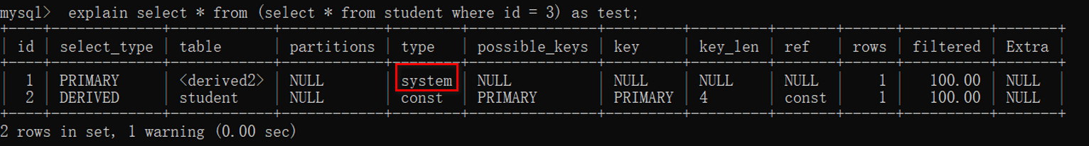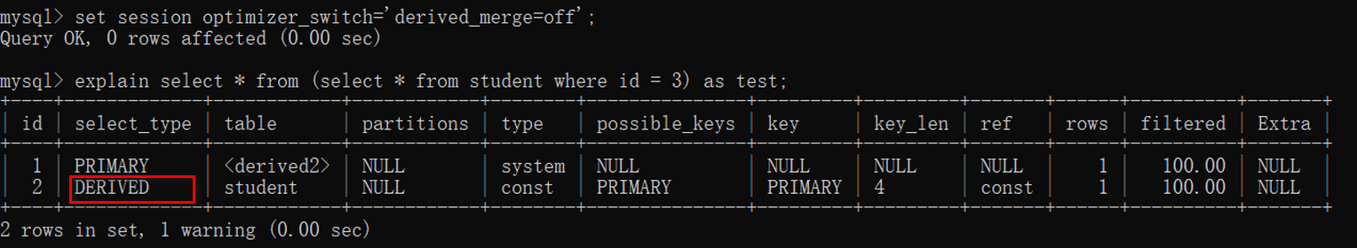 # 例子:set session optimizer_switch='derived_merge=off';explain select * from (select * from student where id = 3) as test;set session optimizer_switch='derived_merge=on';