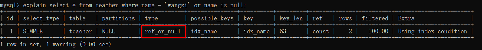 # 例子:explain select * from teacher where name = 'wangsi' or name is null;