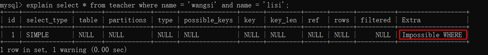 # 例子:explain select * from teacher where name = 'wangsi' and name = 'lisi';