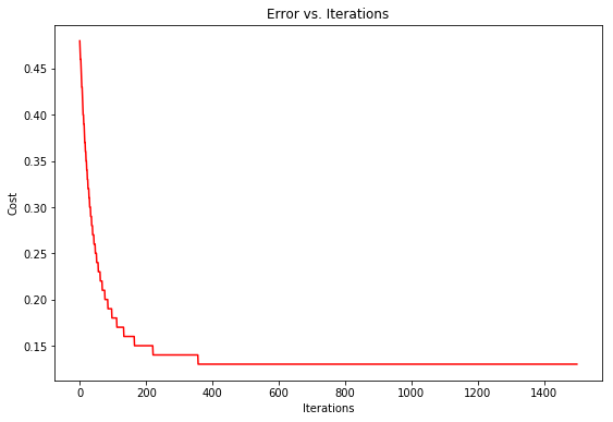 w2 = np.matrix(np.array([0,0,0]))w2_final, cost2_final = gradientDescent(X2, y2, w2.T, alpha, iterations)# perform linear regression on the data set##=============================================================