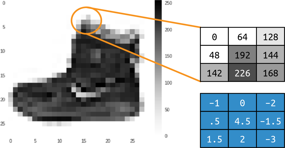 卷积只是一个权重过滤器,用于将像素与其相邻像素相乘,以获得该像素的新值。例如,考虑来自Fashion MNIST的踝靴图像和它的像素值,如图3-1所示。