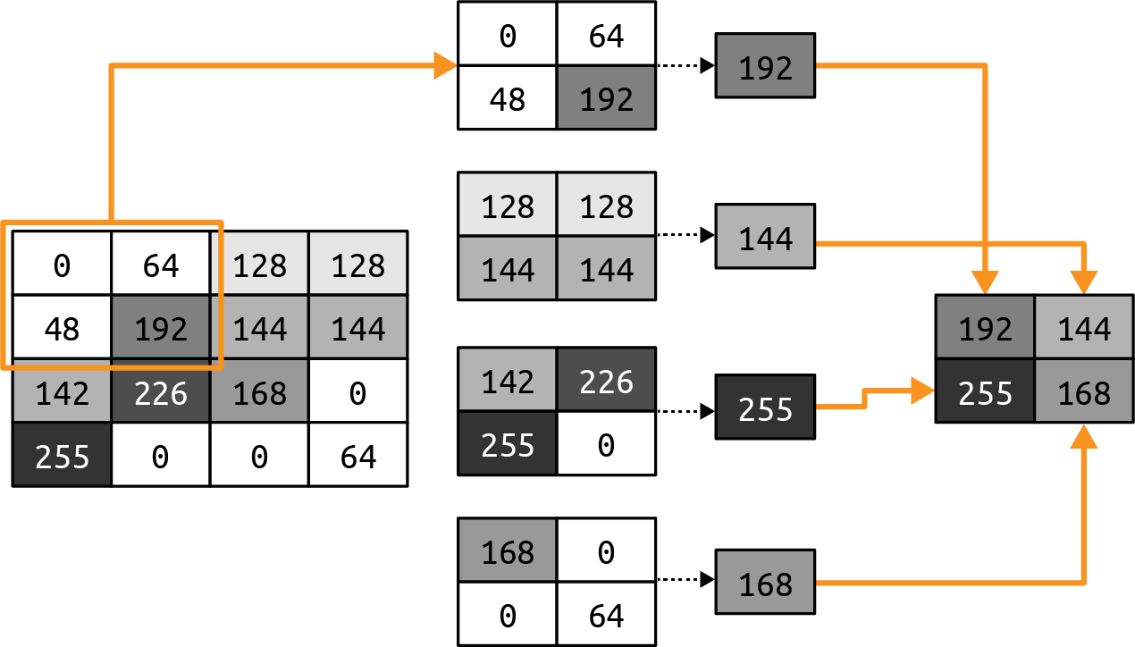 在这种情况下,将左边的框视为单色图像中的像素。然后,我们将它们分组为2 × 2阵列,因此在这种情况下,16个像素被分组为4个2 × 2阵列。这些被称为池。
