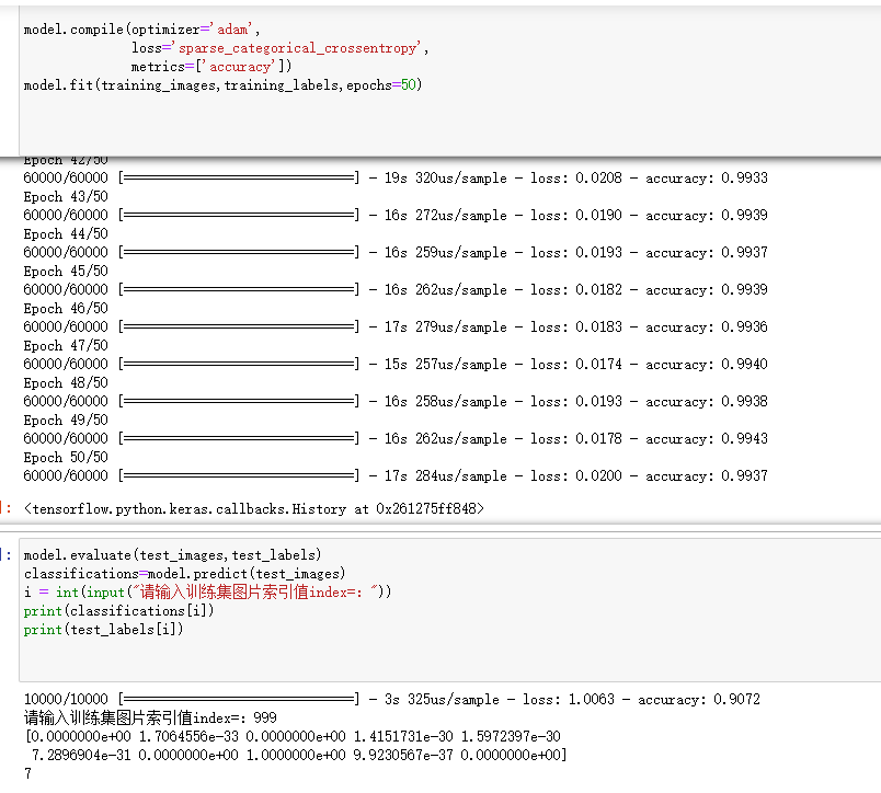 model.fit(training_images,training_labels,epochs=50)model.evaluate(test_images,test_labels)