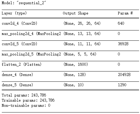 我们最后的10个神经元Dense层接收了之前128个的输出,所以学习到的参数数将是(128 × 10) + 10,也就是1290。