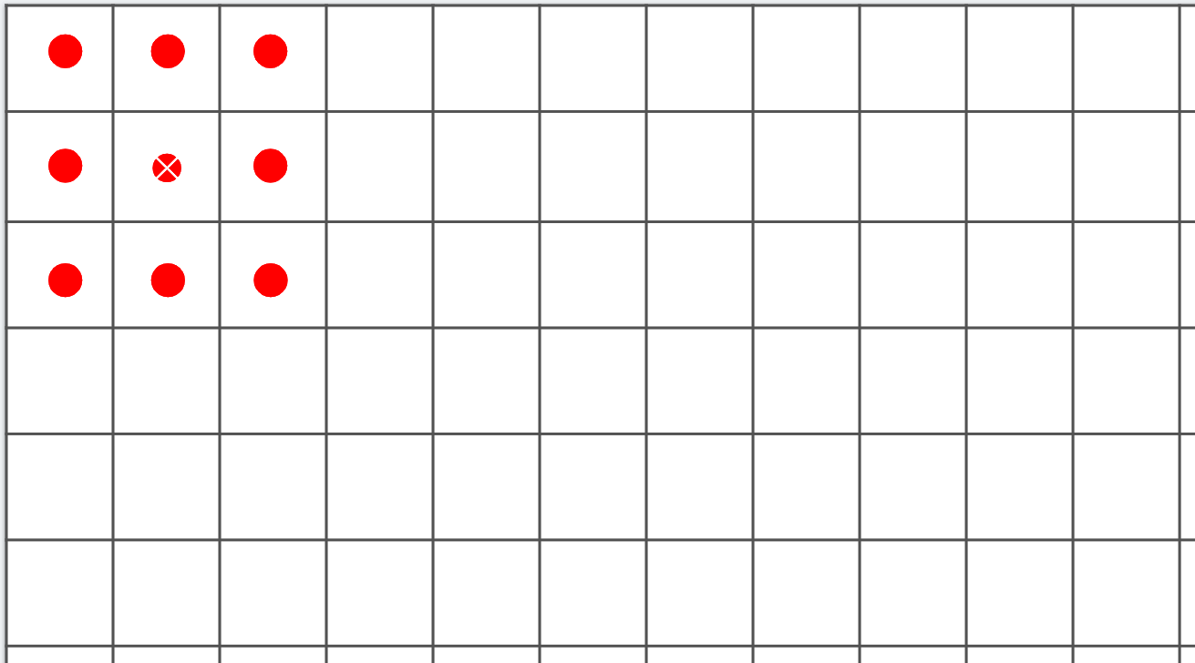 让我们先看一下Output Shape列,了解这里发生了什么。我们的第一层将有28 × 28的图像,并对它们应用64个滤镜。但是由于我们的滤镜是3 × 3,图像周围1像素的边框将会丢失,从而将我们的整体信息减少到26 × 26像素。考虑图3 - 6。如果我们把每个方框作为图像中的一个像素,我们可以做的第一个可能的过滤器从第二行和第二列开始。同样的情况也会发生在图的右边和底部。