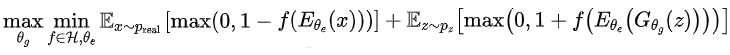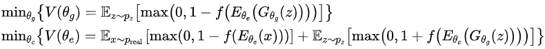 OKGAN 在低维数据(如二维合成数据集)上具有优越的性能。但是如果没有额外的表现能力,它很难生成高质量的图像,而这正是其他 GAN 架构的特点,然而如果通过添加编码器层来弥补的,可以发现编码器能够计算高维数据,如复杂的图像数据集的内核,其中编码器也是一个神经网络,此时 OKGAN 的对抗损失为: