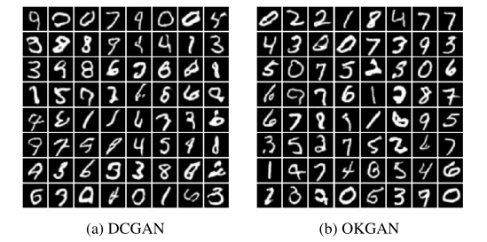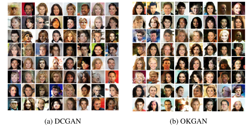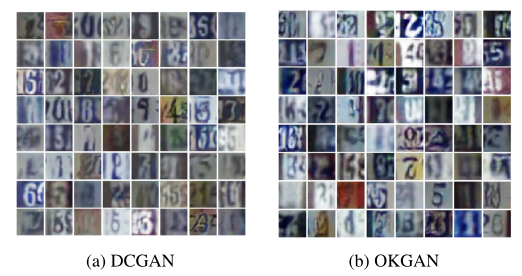 下图为 OKGAN 和 DCGAN 在 MNIST,SVHN,CeleBA 数据集上样本生成的对比示意图,可以看出 OKGAN 生成的样本细节更丰富。
