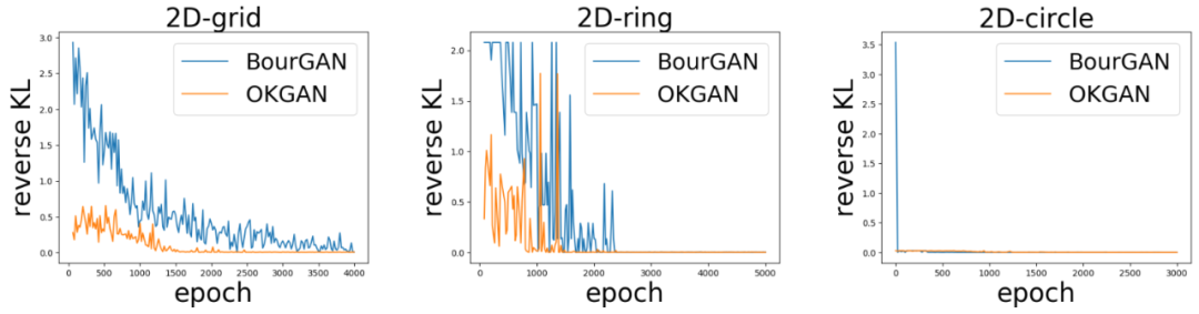 下图为 OKGAN 训练过程中的反向 KL 散度的图示,可以看出 OKGAN 的伪分布比 BourGAN 更快地收敛到真实分布,并且以更稳定的方式训练 OKGAN,由此可知 OKGAN 通过利用基于核的非参数鉴别器来增加生成样本的多样性。