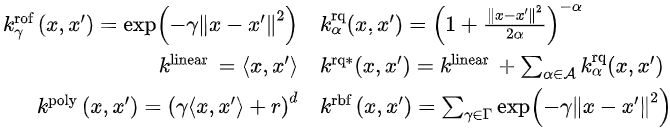 作者探讨了很多核函数,分别有高斯核函数,线性核函数,多项式核函数,有理二次型核函数,混合高斯核函数和混合 RQ 线性核函数,具体形式如下: