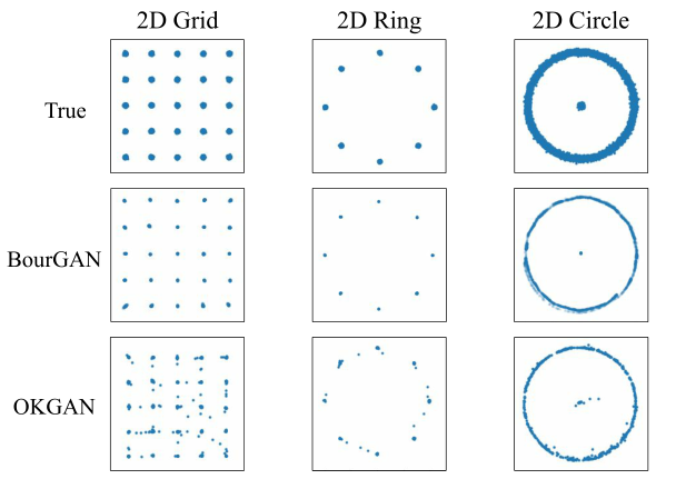 下图为 OKGAN 和其它 GANs 比较多样性学习的比较,可以看出 OKGAN 学习的分布与原来数据分布是最相似的。