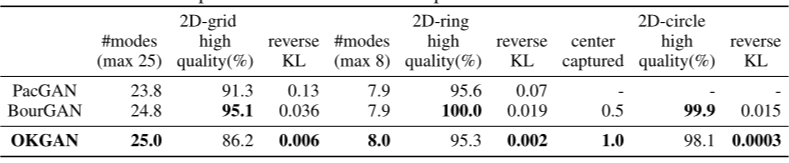 如下表所示,在缓解模式崩溃方面 OKGAN 显示出了最好的性能。与其他 GANs 相比,OKGAN 捕捉所有 2D 合成数据集的所有模式,并且 OKGAN 的反向 KL 散度在这三个数据集中是最低的,这就说明了 OKGAN 能够缓解模式塌缩(即 GAN 能够多样性学习样本数据)。