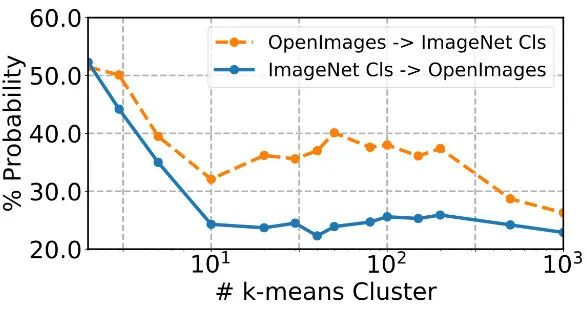 用 k-means 聚类,检查在 OpenImages 的 embedding 里是同一个 cluster 的图片对,在 ImageNet Cls 的 embedding 里是否是一个 cluster 中的,反之亦然,得到的结果如下,在 OpenImages 特征空间中相似的图片,在 ImageNet Cls 中更可能相似,而反之不是这样。