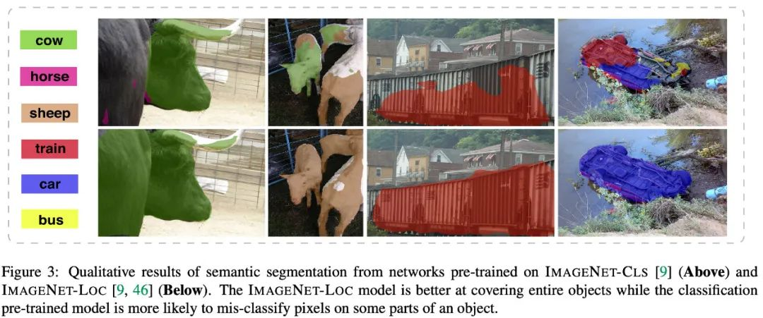 上方是分类预训练的分割结果,下方是检测预训练的分割结果,可见检测预训练模型能够覆盖整个物体,即分类模型无法理解物体边界。Detection pre-training provides a better prior about the spatial extent of an instance which helps in recognizing parts of an object.