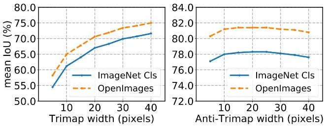 进行了 trimap experiment 判断这个提升是否是由于边缘像素点的分割效果更好造成的。trimap experiment 计算针对距离边缘长度为 x 的像素分类精确度,anti-trimap experiment计 算除去边缘的像素分类精确度。