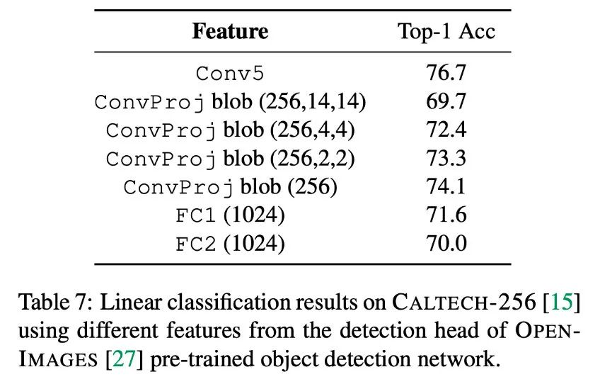 中间层特征 还选择了在 OPENIMAGES 上预训练的检测模型的 detection head 中中间层特征的分类表现,发现 ConvProj blob(256) 上的效果是最好的,FC1 好于 FC2。