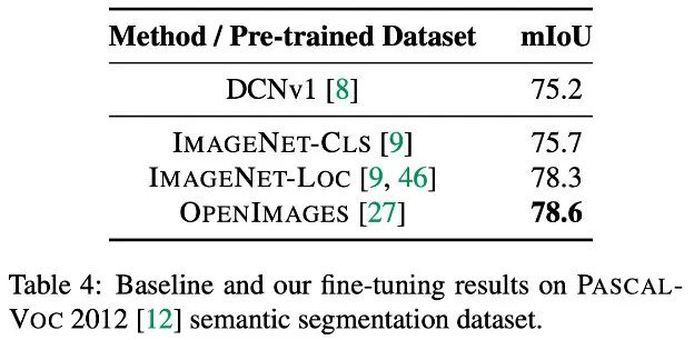 Baseline:还是 Deformable ConvNets 作为 Backbone 模型,在 PASCAL-VOC 2012 进行语义分割 finetune,结果发现有 3 个点的提升: