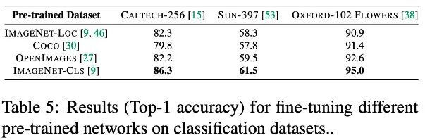 在不同分类数据集上测试不同预训练模型的表现,发现物体检测预训练(前三个数据集)对于图像分类(IMAGENET-CLS)效果表现更差: