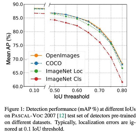 尤其在大 IoU 阈值,OD 预训练能够提高更多 mAP,在 PASCAL-VOC 数据集上,IoU=0.7 时提高了 4.8mAP,IoU=0.5 时只提高 2.2mAP。