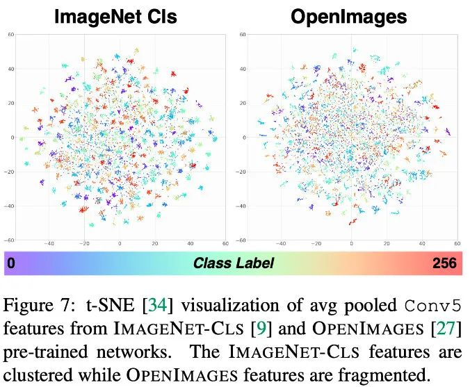 同 tSNE 可视化平均池化的 Conv5 特征,发现在 ImageNet Cls 特征空间中,同一种物体的特征在相同的 cluster 中且距离更近。然而 OpenImages 特征比较分散。