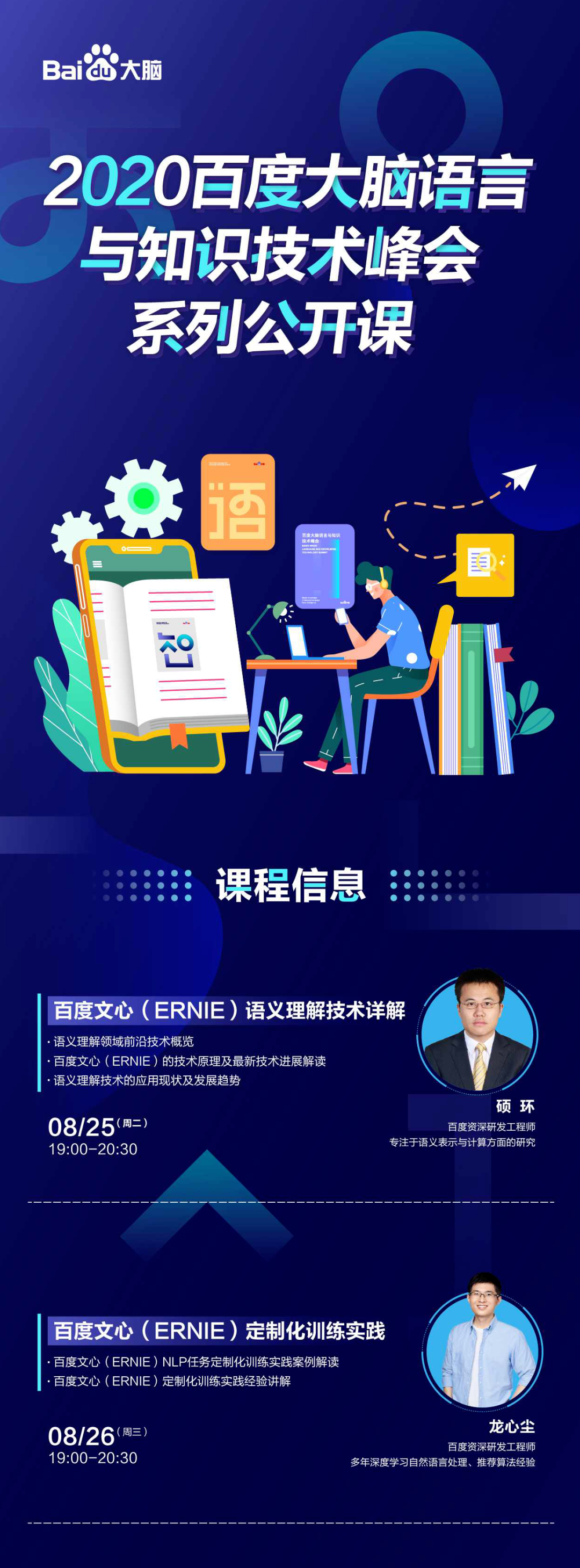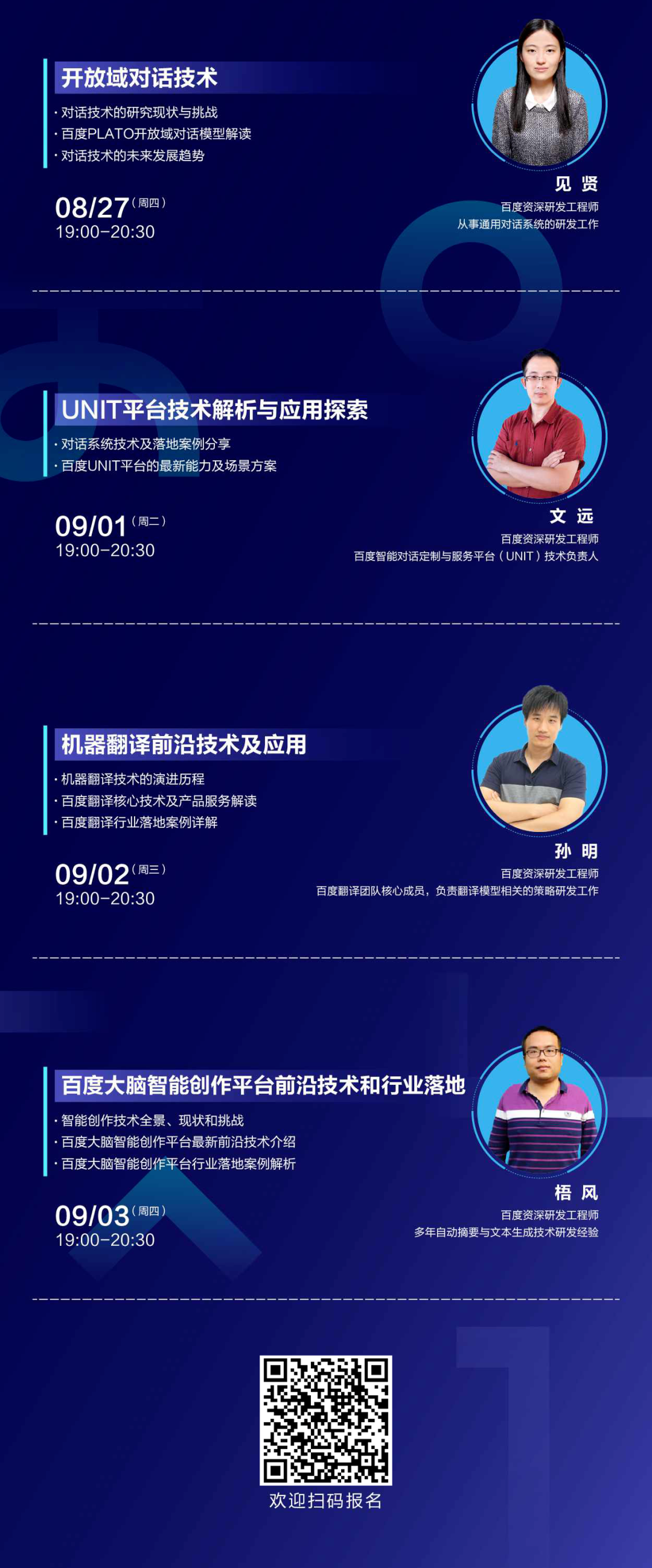 本次峰会将同时开设6场系列公开课,8月25日-9月3日晚7:00-8:30,由百度资深的工程师详细解读在峰会中重磅推出的一系列NLP技术成果,分享丰富的前沿技术、最新产品和实践经验,内容覆盖语义理解技术与平台文心(ERNIE)、开放域对话技术 PLATO、 智能对话定制与服务平台UNIT、机器翻译、智能创作平台等。