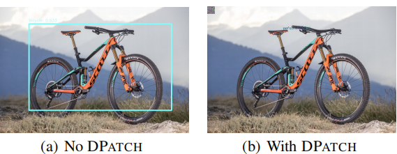 如下图所示,只在单车左上方贴上 40*40 的 Patch,即可让检测器失效。