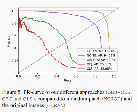 output = output.view(batchsize, self.n_anchors, n_ch,fsize * fsize)output = output.transpose(1, 2).contiguous()output = output.view(batchsize, n_ch,self.n_anchors * fsize * fsize)output_objectness = torch.sigmoid(output[:, 4, :]) # [batch, 1805]output = output[:, 5:n_ch, :] # [batch, 80, 1805]# perform softmax to normalize probabilities for object classes to [0,1]normal_confs = torch.nn.Softmax(dim=1)(output)# we only care for probabilities of the class of interest (person)confs_for_class = normal_confs[:, 0, :]confs_if_object = confs_for_class * output_objectness但是作者最后也尝试了多种组合方式,只用分类 CLS 的 loss,只用有无目标 OBJ 的 loss,以及代码所示的两个都用的 loss,结果如下图,AP 应该越低越好。而用 OBJ-CLS 的 AP 值有 42.8%,只用 OBJ 的 AP 值为 25.53%,只用 CLS 的 AP 值为 82.08%。所以要是无目标攻击的话,最好只攻击 OBJ 的 loss。