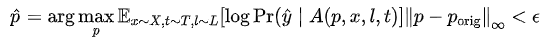 就是最大化目标类别的概率期望,导致分类器误判即可,A 就是 apply 函数,把 Patch 粘贴到图中的方式,p 为 Patch 的参数,x 为原图,l 为位置。