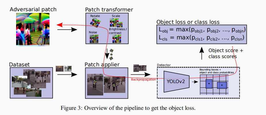 这篇是 AAAI 2019 Workshop 的论文,这个思路是最贴切赛题而且非常简单容易实现的,就是在原图的基础上直接添加 Patch,固定住 YOLO 或者 Faster R-CNN 等检测器的权重,反向传播只更新 Patch,文章只在图片的左上角贴了 Patch,这里需要看他的损失函数如何设计的。