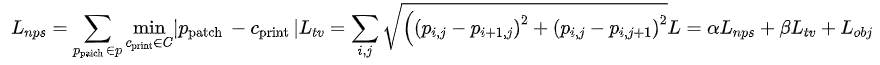 损失函数包含了三个,其中前两个 是关于物理因素的,是可否打印出来进行物理攻击的因素,在 中 是 patch P 中的一个像素, 是一组可打印颜色 C 集合中的一种颜色。