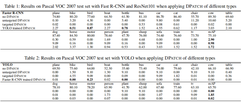 从指标上看,小物体如鸟这样的无目标攻击会比较困难。论文作者指出 DPatch 是具有泛化能力的,YOLO 训练出来的 Patch 给 Faster-RCNN 用也是没问题的,反之也行。
