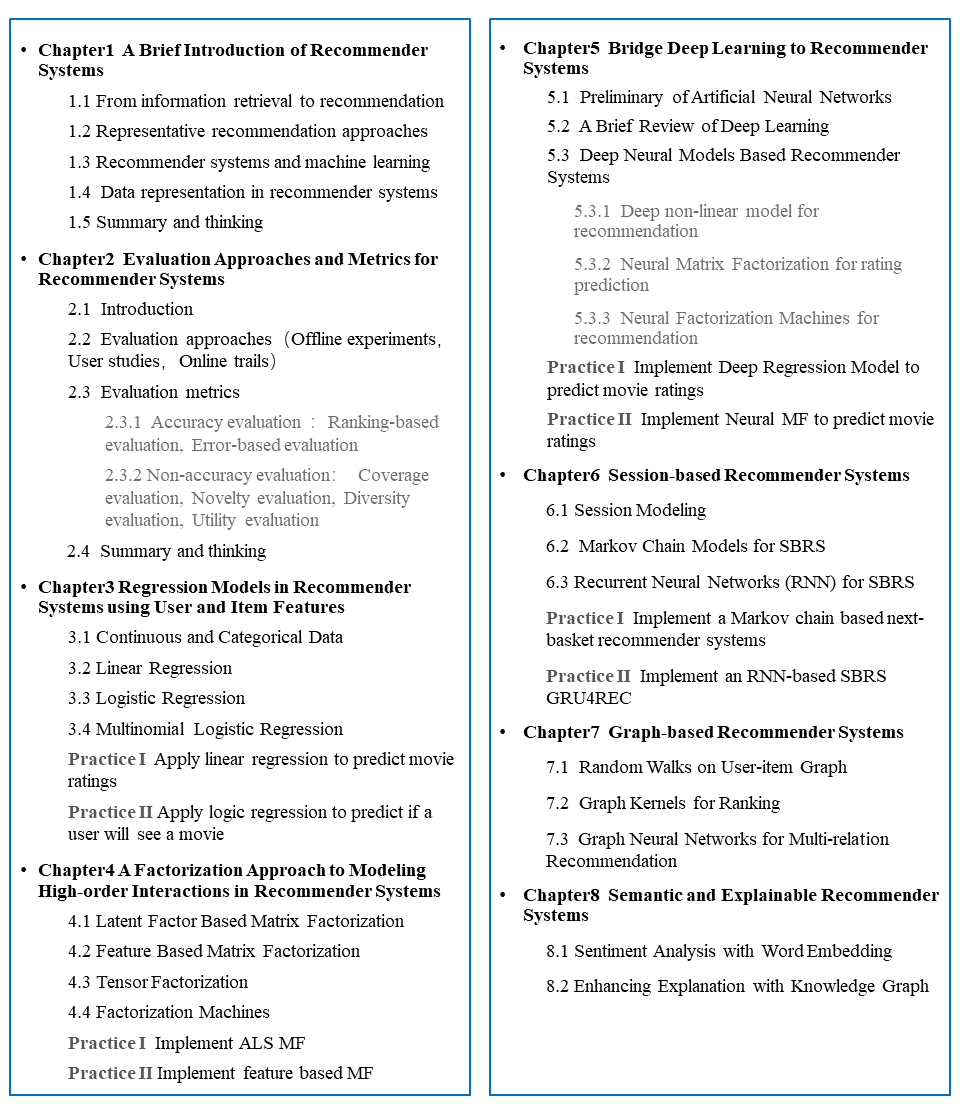 因此,市场对构建智能推荐系统高级人才需求日益增大。然而,国内鲜有高校开设推荐系统的相关课程。虽然现在也有一些在线课程,但是很多课程为了迎合转行从业者以及科研项目的需求,在课程设置中更加偏重于实践操作,往往忽视理论层面系统完整的知识体系。