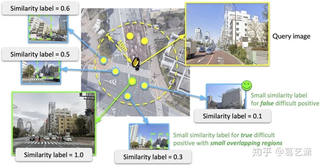 我们提出利用目标图像与数据库图像之间的相似性作为软标签对模型训练进行监督。具体来说,对于假性正样本,或具有较小重叠区域的正样本,我们希望设置较小的相似性标签;而针对与目标图像重叠区域较大的正样本,我们希望设置较大的相似性标签。这样的话,在相似性标签的监督下,模型可以模拟出目标图像与不同匹配图像之间距离关系,从而有针对性地进行表征学习。