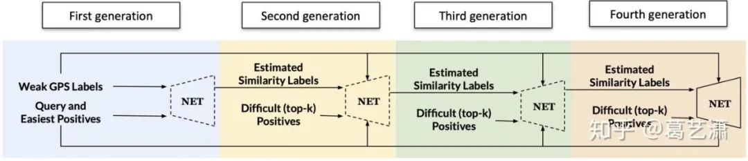 那么,如何获得相似性标签呢?直接通过当前模型的数据进行预测是不可行的,这就类似于自己站在自己的脚上,既没有够到更高的区域,反而会站不稳(导致误差放大)。所以,我们提出,通过迭代训练(Training in Generations)的方案,将第一代模型的输出作为第二代模型的监督,以此类推。