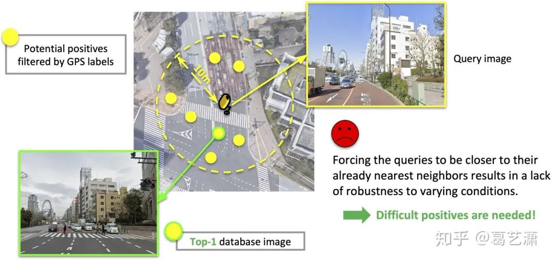 我们认为,困难的正样本(Difficult Positives)在表征学习中不可缺少。但是,简单地使用 top-k 图像(这里 top-k 指的是利用特征距离进行排序后的 top-k 数据库图像)作为正样本进行学习具有较大的噪声。
