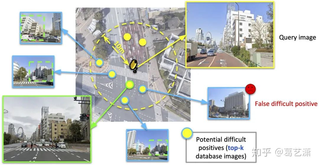 图像检索的关键在于如何学习到具有辨别性的图像特征,而在模型的训练中往往都需要有正样本和负样本。具体来说,模型需要学习让目标图像的特征靠近正样本而远离负样本。在仅有 GP S的图像定位数据集中,我们可以首先通过 GPS 进行筛选,比如 GPS 相距 10m 以内的图像为潜在正样本(Potential Positives)。