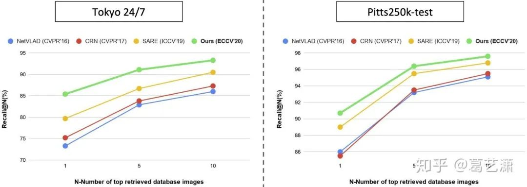 下图是实验结果,我们的模型只在一个数据集(Pitts30k-train)上进行了训练,可以很好地泛化到不同的测试集上,例如在 Tokyo 24/7 和 Pitts250k-test 上均取得了最先进的精度。其中,Tokyo 24/7 数据集难度最大,因为图像的光照、角度、拍摄装置等条件都具有很强的多样性,我们在 Recall@1 准确度上超出此前最先进的 SARE 算法(发表于 ICCV’19)5.7% 个点。