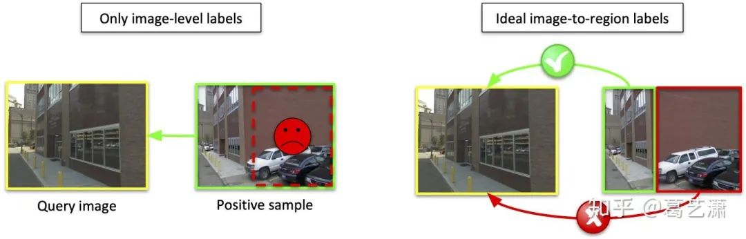 如下图左边所示,只使用图像级的监督会使得目标图像与正样本图像的所有局部特征都趋向于相似,这样的监督会损害局部特征的辨别性学习。所以,我们提出,理想的监督应当为区域级的监督,如下图右边所示,让正样本中的正区域(Positive Regions)靠近目标图像,而负区域(Negative Regions)远离目标图像。