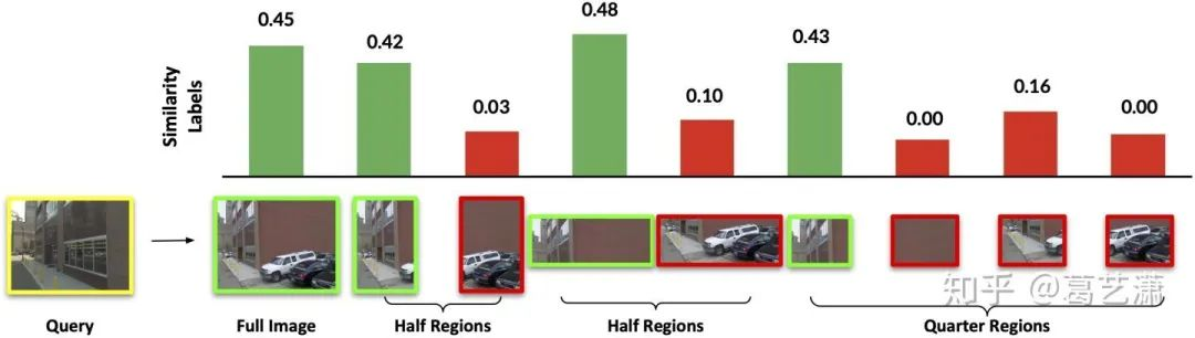 为了实现区域级的监督,我们将匹配的正样本分解为 4 个二分之一区域和 4 个四分之一区域,并将图像-图像间的相似性监督细粒化为图像-区域间的相似性监督,以上文中所述迭代训练的方式进行学习。具体来说,第一代模型所预测的图像-区域的相似性标签用于监督第二代模型的图像-区域学习。