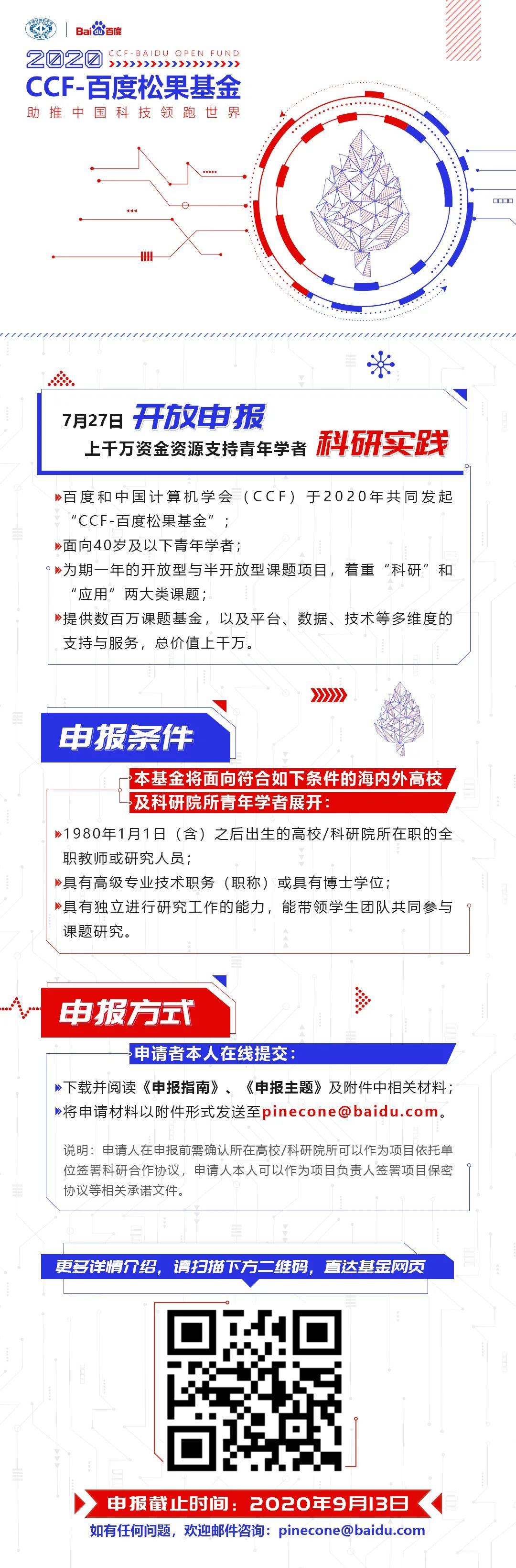 松果基金已开放申报通道,公布申请细节,将投入上千万资金资源支持青年学者科研实践。有意向的学者可在百度搜索“CCF-百度松果基金”进入官方申请页面,下载申请表及相关材料进行报名,申报截至2020年9月13日。