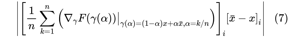 最后就是这个积分形式的量怎么算呢?深度学习框架没有算积分的功能呀。其实也简单,根据积分的“近似-取极限”定义,我们直接用离散近似就好,以式(6)为例,它近似于: