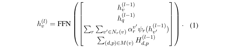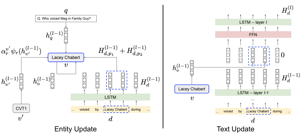 实体 令 表示文档 中位置 的实体。实体节点的更新涉及一个单层前馈神经网络(FFN),其中包含四个状态的拼接: