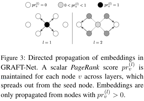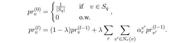 有向传播 许多问题都需要多跳推理,它沿着从问题中提到的种子节点到目标答案节点的路径。为了鼓励传播嵌入的行为,作者开发了一种技术,该技术受 IR 中的个性化 PageRank 启发。传播开始于问题中提到的种子结点 ,除结点的向量表示 之外,作者还维护一个标量 PageRank 分数,度量从一个种子实体到当前实体的所有权重: