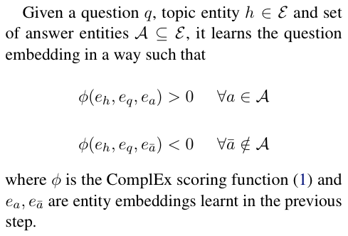 该模块直接使用了 ComplEx 嵌入,其中包含知识图谱中所有实体、关系的嵌入。实体嵌入用于学习头实体、问题和答案实体之间的三元组评分函数。根据 QA 训练集中 KG 实体的覆盖范围,可以将此处学习的实体嵌入保持冻结状态,或者在后续步骤中对其进行微调。