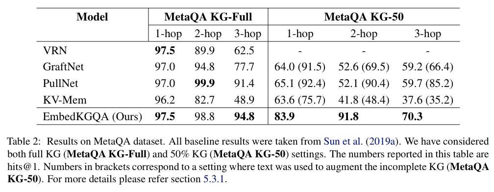 上表实验数据来自于 EmbedKGQA 在 MetaQA 数据集上的实验。可以看出 GraftNet、PullNet 与 EmbedKGQA 在 2-hop 以内的表现都相当好,但是在知识库存在较多缺失链接的时候,EmbedKGQA 的优势显现出来。
