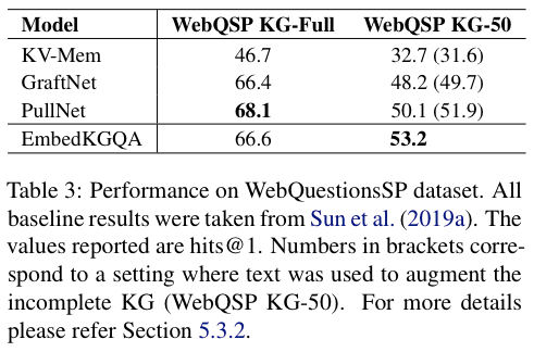 EmbedKGQA 在给定完整知识图谱的情况下,WebQSP 表现虽然没有达到 SOTA,仍然表现良好,并在知识图谱缺失的情况下显示出优势。