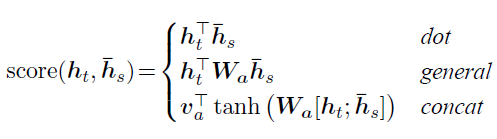 这里的 等价于上节的 , 第一项为点积运算,在计算相似度上还有常用的 cosine 计算(文献 [4]);第二项常用于输入输出维度不对等,使用中间矩阵相乘将其对齐;第三项为二者进行拼接后,使用 tanh 函数进行激活。