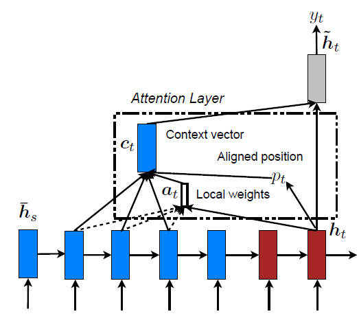 Local attention 相对于 global attention 直观的感受,专注于小窗口的上下文,也就是不考虑所有的编码隐层状态,模型结构图如下所示。为实现该想法,要在每一时刻解码时构造一个位置变量 ,记录当前解码位置,该窗口就可以表示为 ,其中 D 为窗口大小,为实验选值。