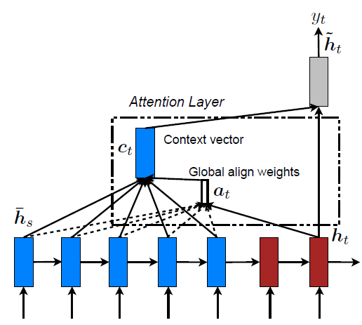 以下简称 Global attention 为 GA, GA 在推导 c_t 时考虑了所有的编码层隐层状态,模型图如下图所示,其中蓝色表示编码码层,红色表示解码层。