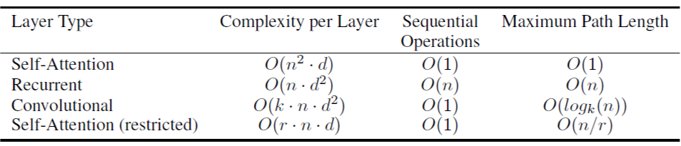在文献 [5] 中给出了不同层模型(self-attention\RNN\CNN)在层复杂度、序列操作、最大路径长度的对比,结果如下图所示。