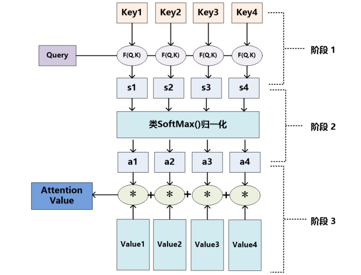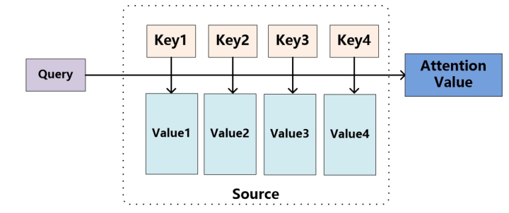 source 中包含键值对(相当于文献 [1] 中的编码层隐层状态),计算 Target 中query(前一时刻的解码层隐层状态)与 key 的相关性,得到 key 对应 value 的权重(),最后对 value 加权求和得到 attention value。